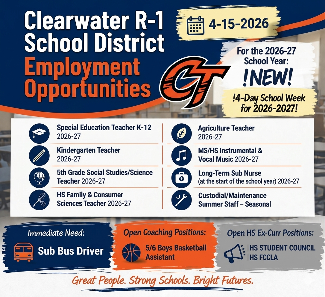 The goal of the Clearwater School Foundation is to promote the educational excellence in the Clearwater School system by generating resources from private funds to improve facilities, equipment, and programs for the benefit of the students, faculty and organizations. The Foundation is committed to future fundraising that will result in grants for teachers and other projects that will benefit the educational environment of Clearwater R-I schools. Alumni and other community members can contribute to this effort through tax-deductible donations, memorials, and honorariums, etc.