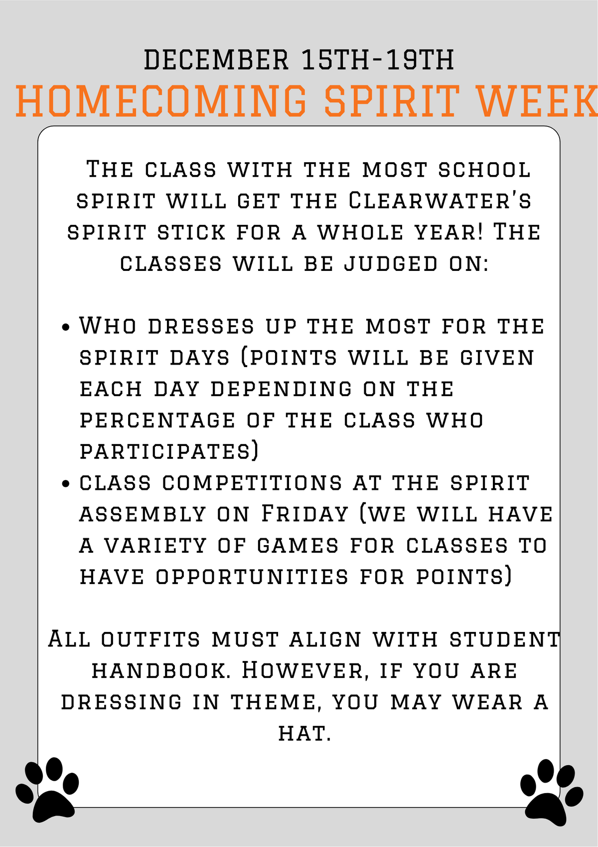 Please be sure to look over the themes for spirit week and read over the guidelines posted below!!